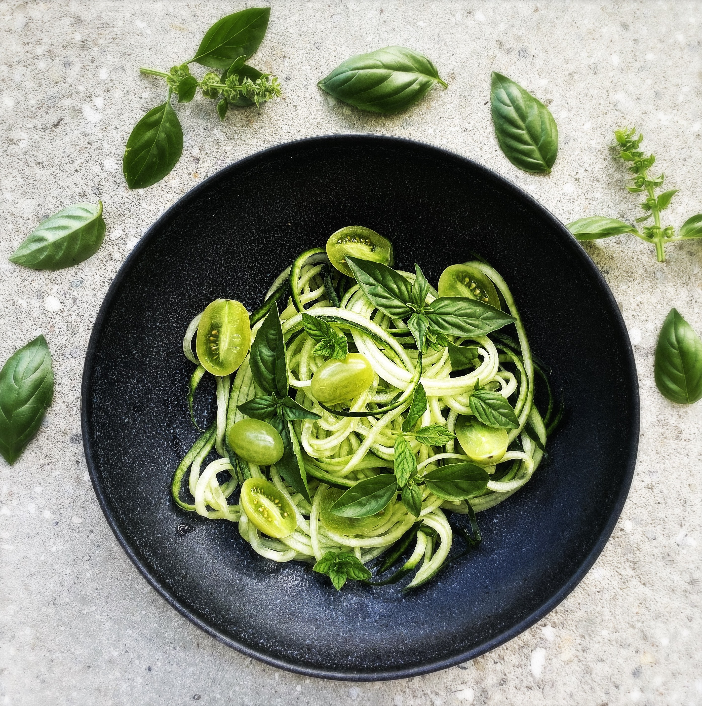 Ce soir, pour célébrer l’été et manger un peu léger, ce sera un plat tout vert: des linguines de concombre aux myrtilles & huile verte. Pour cette recette et pour 4 personnes, il vous faudra 1 grand concombre, 125 grammes de myrtilles, 125 grammes de tomates vertes, 1 citron vert, 1 bouquet de basilic, 6 brins de menthe poivrée et 20 centilitres d’huile d’olive.