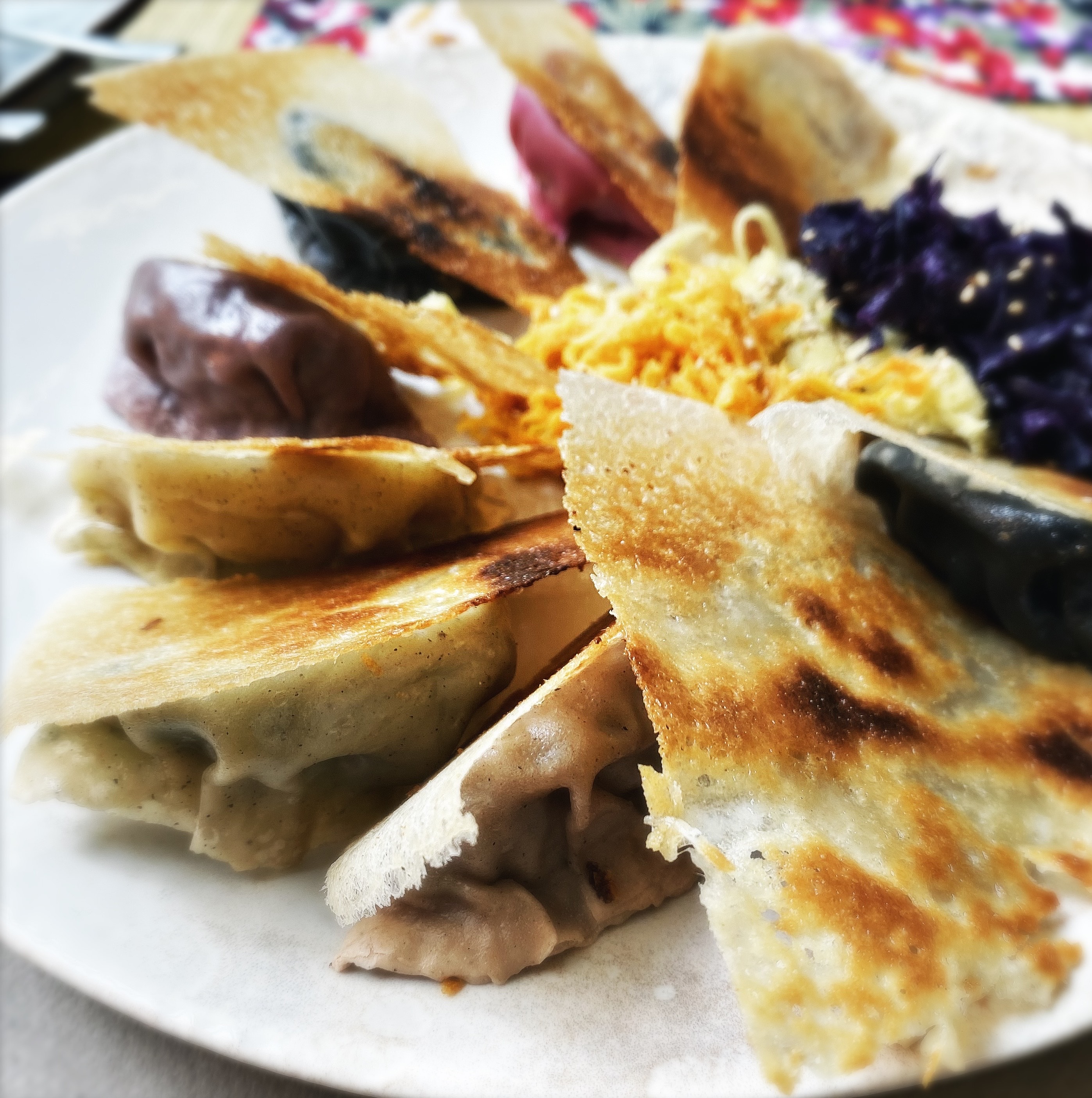 Et pour la nourriture, j’ai choisi – les deux fois – le mix des raviolis: boeuf haché et mariné au thé rouge, choux rouge et haricots verts; boeuf haché et mariné au thé rouge, tomates sautées et courgettes; poulet mariné au thé vert, tofu et épinard; poulet mariné au thé vert, shitake et maïs; poisson blanc mariné au thé vert, scamorza fumée; poisson blanc mariné au thé vert, mix de champignon; porc mariné au thé blanc, châtaigne d’eau chinoise; porc mariné au thé blanc, bolet et gruyère et enfin végétarien: tofu, œuf, épinard et courgette.