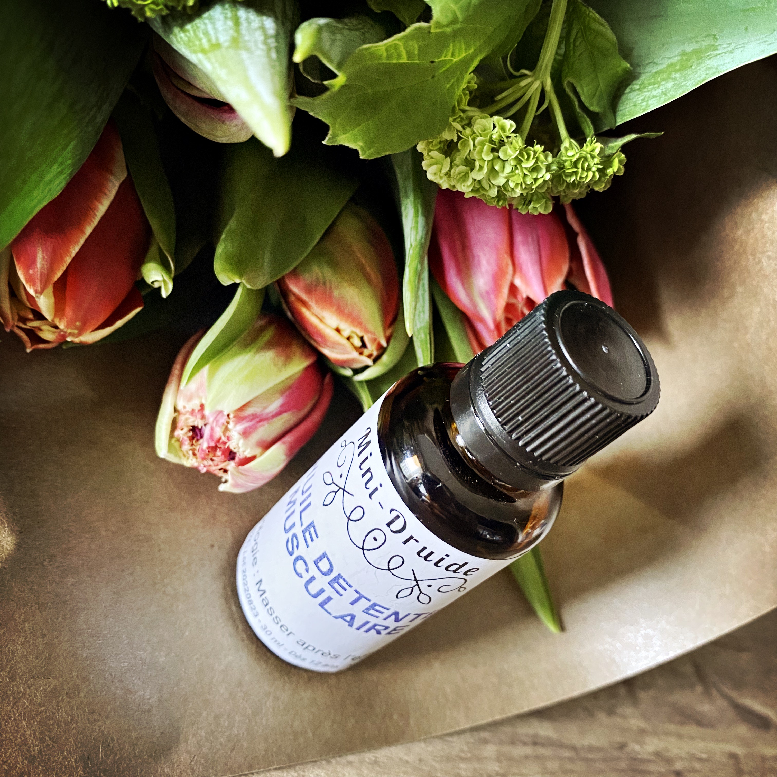 Alors voilà… hier matin, je me suis réveillée avec un torticolis. Ce n’est pas le premier, mais de bleu… j’avais oublié! J’avais oublié que ça fait si mal, mais que surtout ça fait mal en continue et que ça met les nerfs à rude épreuve. Du coup: zéro patience! Zéro patience avec moi et zéro patience avec les autres! Heureusement un petit ange gardien a vu mes stories sur Instagram et m’a envoyé un colis en urgence qui est arrivé à mon réveil ce matin. Ce petit ange, c’est Mini-Druide et elle m’a envoyé un flacon d’huiles essentielles « Détente Musculaire ». Moi… je crois à fonds aux vertus des huiles essentielles. J’avais un prof de chimie incroyable au collège et ouvert à tellement de choses. Il nous a parlé longuement des vertus de ces huiles et je garde cet enseignement en moi.