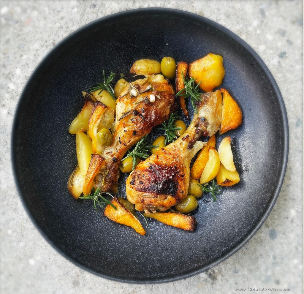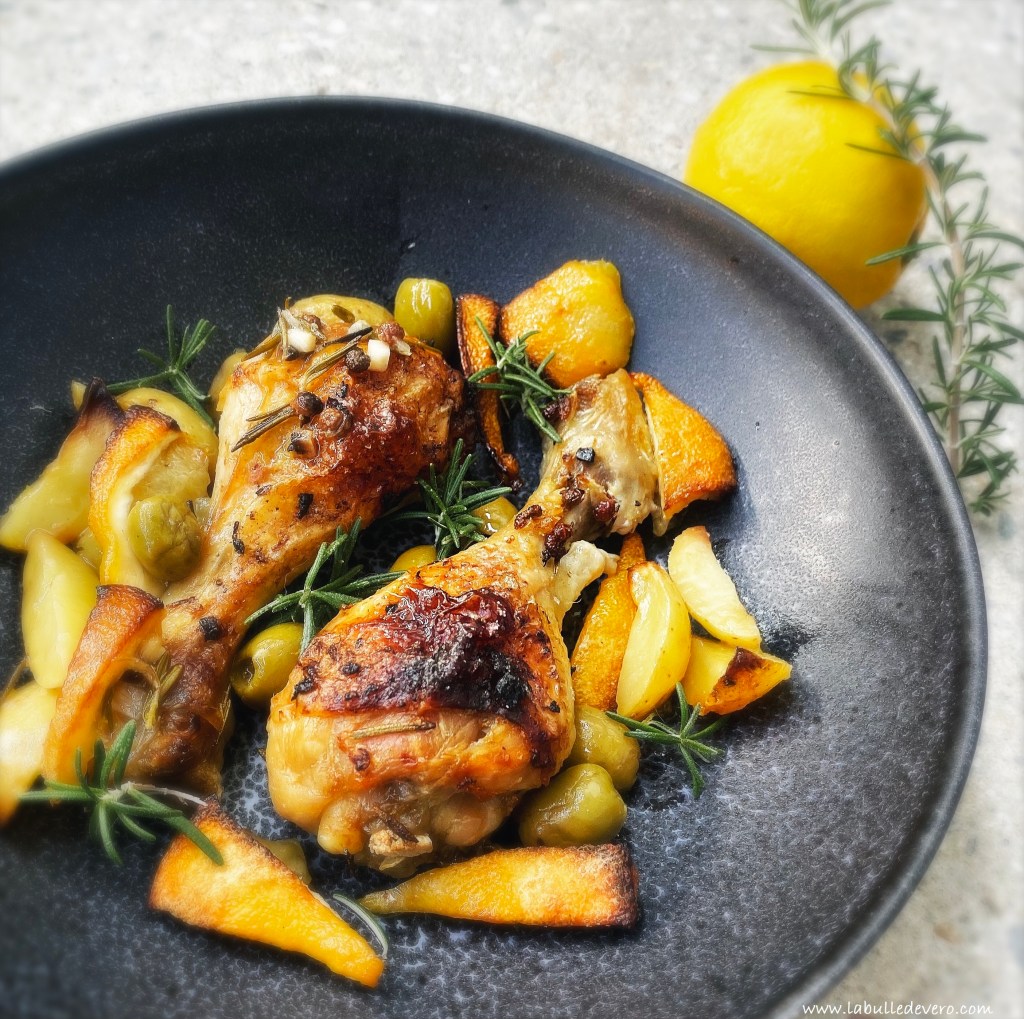 Le beau ciel bleu que nous avons eu aujourd’hui me donne le sourire et tant d’énergie! Cela fait tellement du bien (malgré le fait qu’il tarde à se lever le matin…). Et du coup, je vous propose un plat qui apporte le soleil de l’été mais aussi la chaleur dont nous avons besoin pour affronter l’automne qui se met en place: Un poulet au citron et au romarin. Pour cette recette, il vous faudra soit un poulet en morceau, soit des 5-6 cuisses, 2 citrons bio, 2 gousses d’ail, 160 grammes d’olives vertes ou noires (selon les goûts), du romarin frais, de l’huile d’olive, du sel et du poivre. C’est parti!
